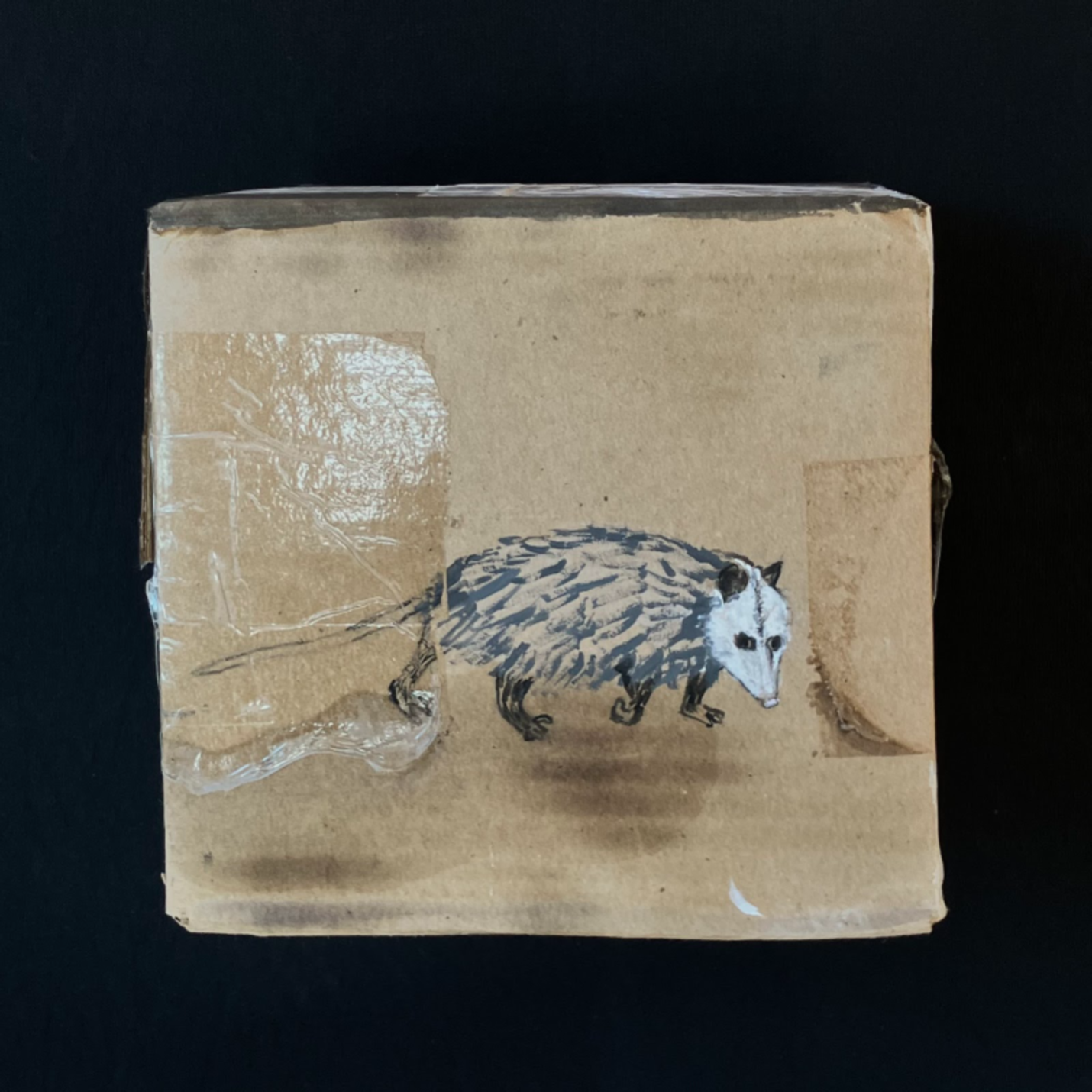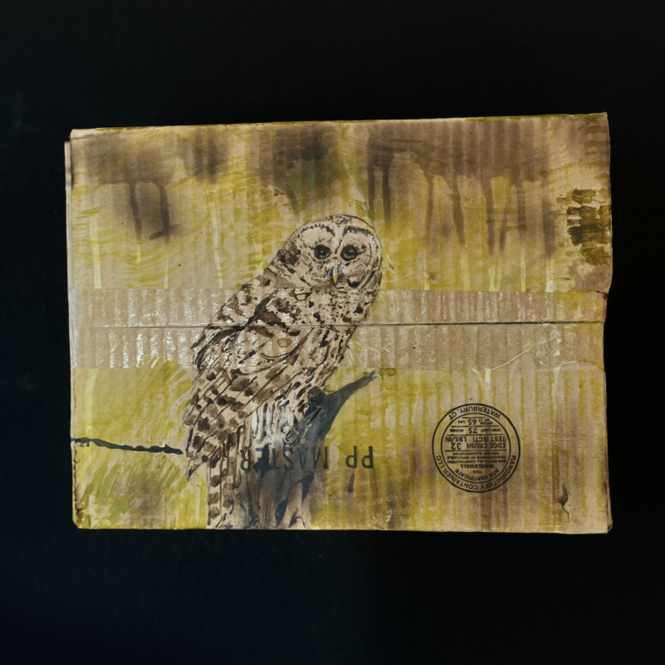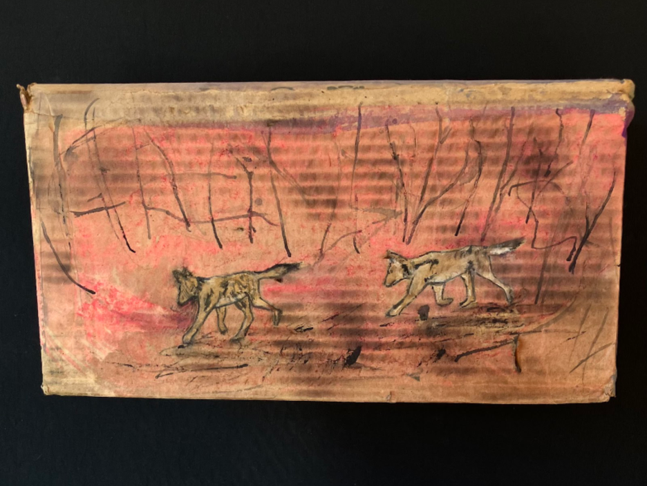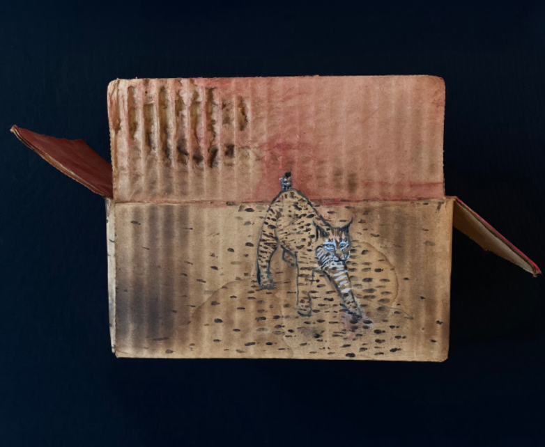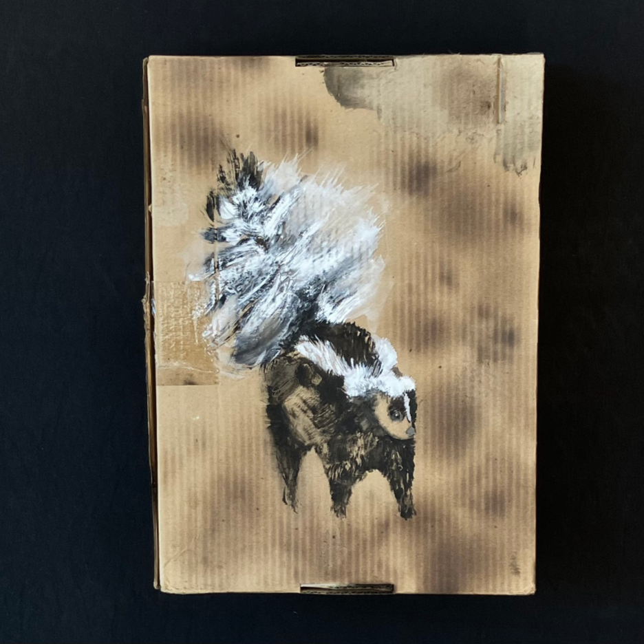 Opossum. 2024. Acrylic paint, olive oil, scorching on cardboard box. 7" high x 7.25" wide x 7” deep | American Red Fox. 2025. Acrylic paint, scorching on cardboard box. 8 high" x 10" wide x 7" deep | Wooly Bear Caterpillar. 2025. Acrylic paint, scorching on cardboard box. 3" high x 9" wide x 2" deep | Milk Snake. 2025. Acrylic paint, scorching on cardboard box. 8" high x 29" wide x 6" deep | Bobcat. 2024. Acrylic paint, scorching on cardboard box. 6" high x 7.5" wide x 5" deep | Black Bear. 2024. Acrylic paint, bleach, blueberry juice, scorching on cardboard box. 10" high x 15" wide x 10" deep | Barred Owl. 2025. Acrylic paint, scorching on cardboard box. 9.5" high x 12.5" wide x 7" deep | Snapping turtle. 2025. Acrylic paint, scorching on cardboard box. 11" high x 13" wide x 4" deep | Coyotes Running Through Burning Woods. 2024. Acrylic paint, olive oil, scorching on cardboard box. 8" high x 15.5" wide x 6" deep.