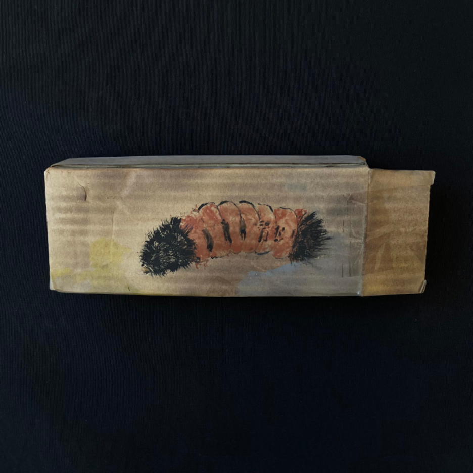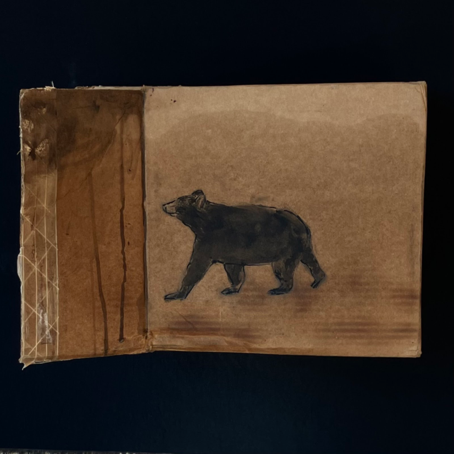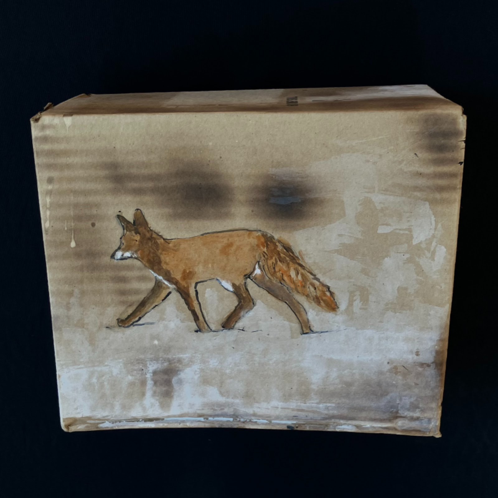 Opossum. 2024. Acrylic paint, olive oil, scorching on cardboard box. 7" high x 7.25" wide x 7” deep | American Red Fox. 2025. Acrylic paint, scorching on cardboard box. 8 high" x 10" wide x 7" deep | Wooly Bear Caterpillar. 2025. Acrylic paint, scorching on cardboard box. 3" high x 9" wide x 2" deep | Milk Snake. 2025. Acrylic paint, scorching on cardboard box. 8" high x 29" wide x 6" deep | Bobcat. 2024. Acrylic paint, scorching on cardboard box. 6" high x 7.5" wide x 5" deep | Black Bear. 2024. Acrylic paint, bleach, blueberry juice, scorching on cardboard box. 10" high x 15" wide x 10" deep | Barred Owl. 2025. Acrylic paint, scorching on cardboard box. 9.5" high x 12.5" wide x 7" deep | Snapping turtle. 2025. Acrylic paint, scorching on cardboard box. 11" high x 13" wide x 4" deep | Coyotes Running Through Burning Woods. 2024. Acrylic paint, olive oil, scorching on cardboard box. 8" high x 15.5" wide x 6" deep.