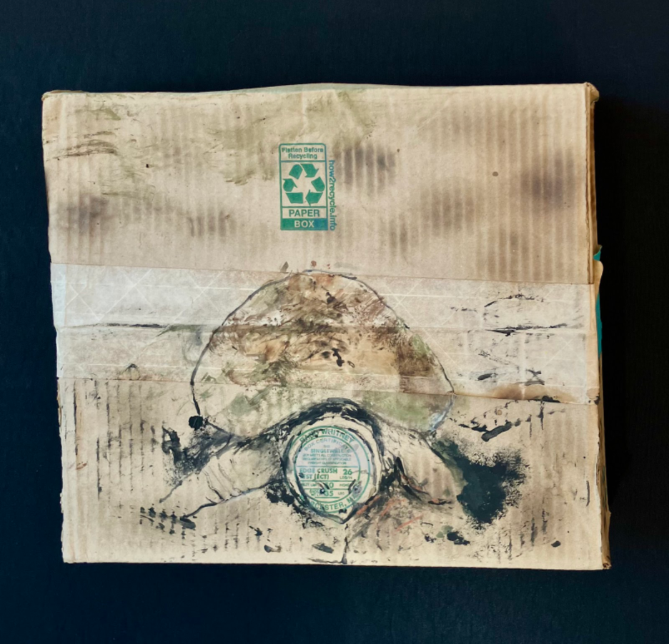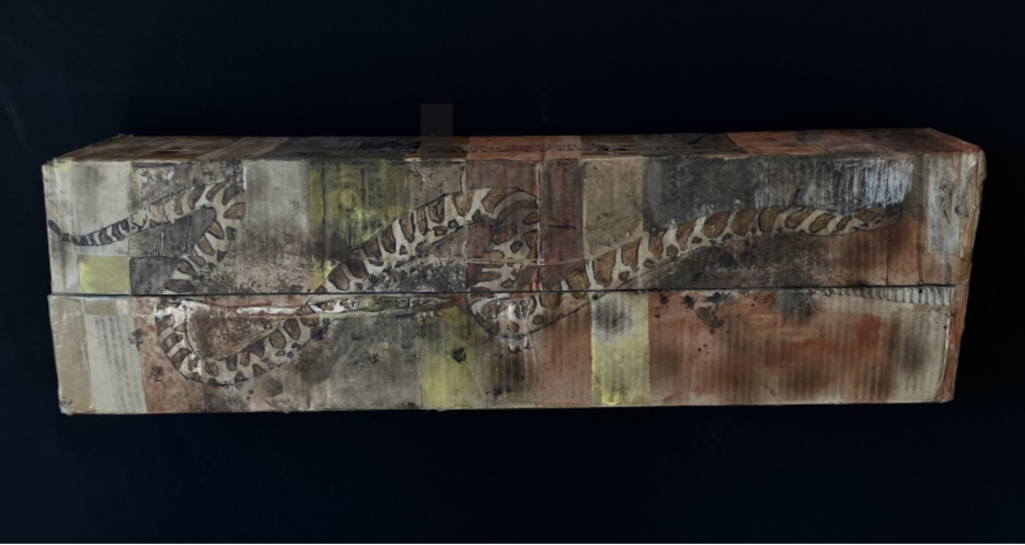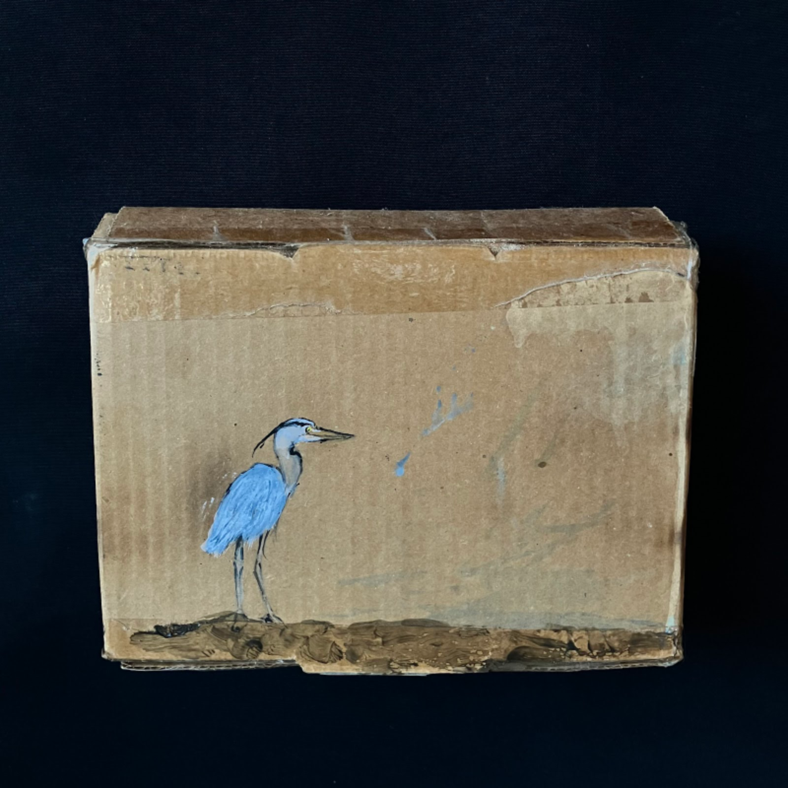 Right: Great Blue Heron. 2024. Acrylic paint, bleach, olive oil, scorching on cardboard box. 7.25” high x 9” wide x 3” deep