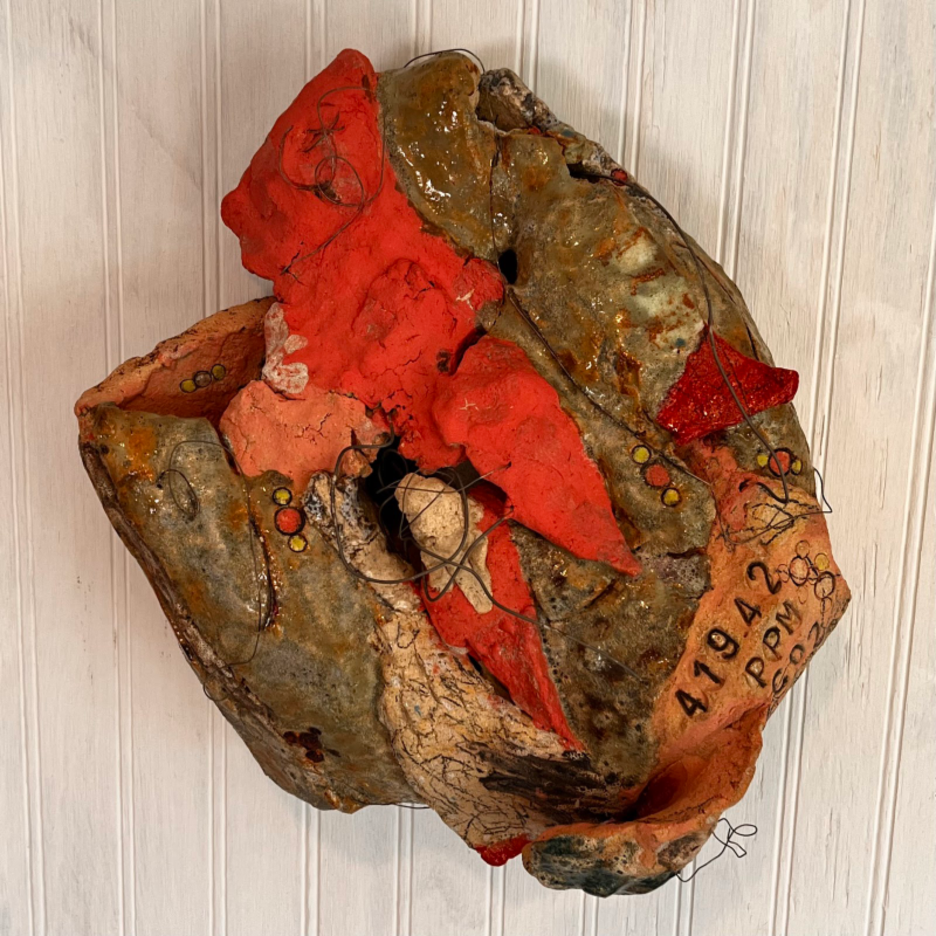 411.31 ppm CO2 avg. May 2018. 2018. White stoneware. 11" high x 12" diameter. | 417.07 ppm CO2 avg. May 2020. 2020. Red stoneware. 12” high x 10.5" diameter. According to Dodds, the Black Lives Matter Movement that followed the murder of George Floyd in May 2020 advocates for climate change justice as well as racial justice because they are deeply intertwined. | 419.13 ppm CO2 avg. May 2021. 2021. White stoneware, nichrome wire. 12” high x 12” diameter.