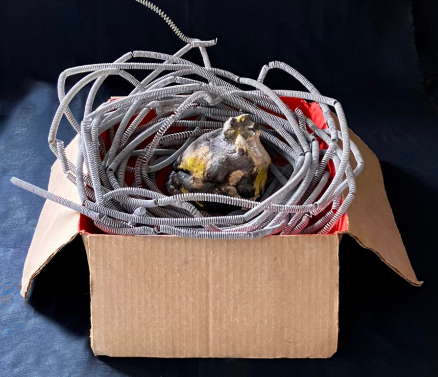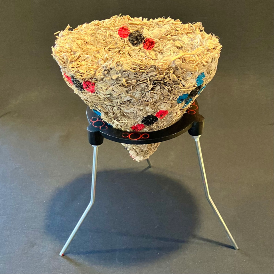 Affordable Nest, Heat Included. 2022 & 2025. White stoneware, salvaged kiln elements, cardboard box, acrylic paint. 7" high x 8" wide x 8" deep. | Bunsen Burning Nest #1. 2025. Myceliated substrate, cardboard, acrylic paint. 12" high x 10" wide x 10” deep. | Bunsen Burning Nest #2. 2025. Myceliated substrate, cardboard, gold leaf. 12" high x 10" wide x 10” deep. | Monument to the Future Post-Digital Era, study model. 2025. Myceliated substrate, pokeberry juice, firewood. 16" high x 4" wide x 4" deep.