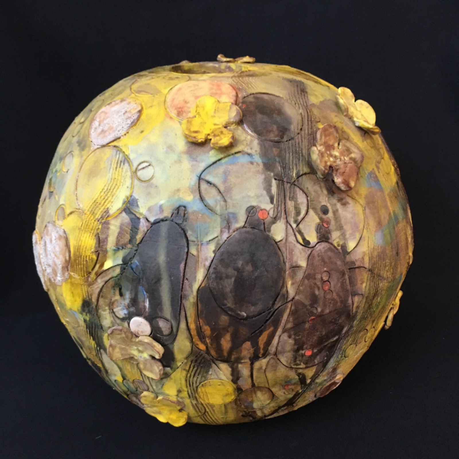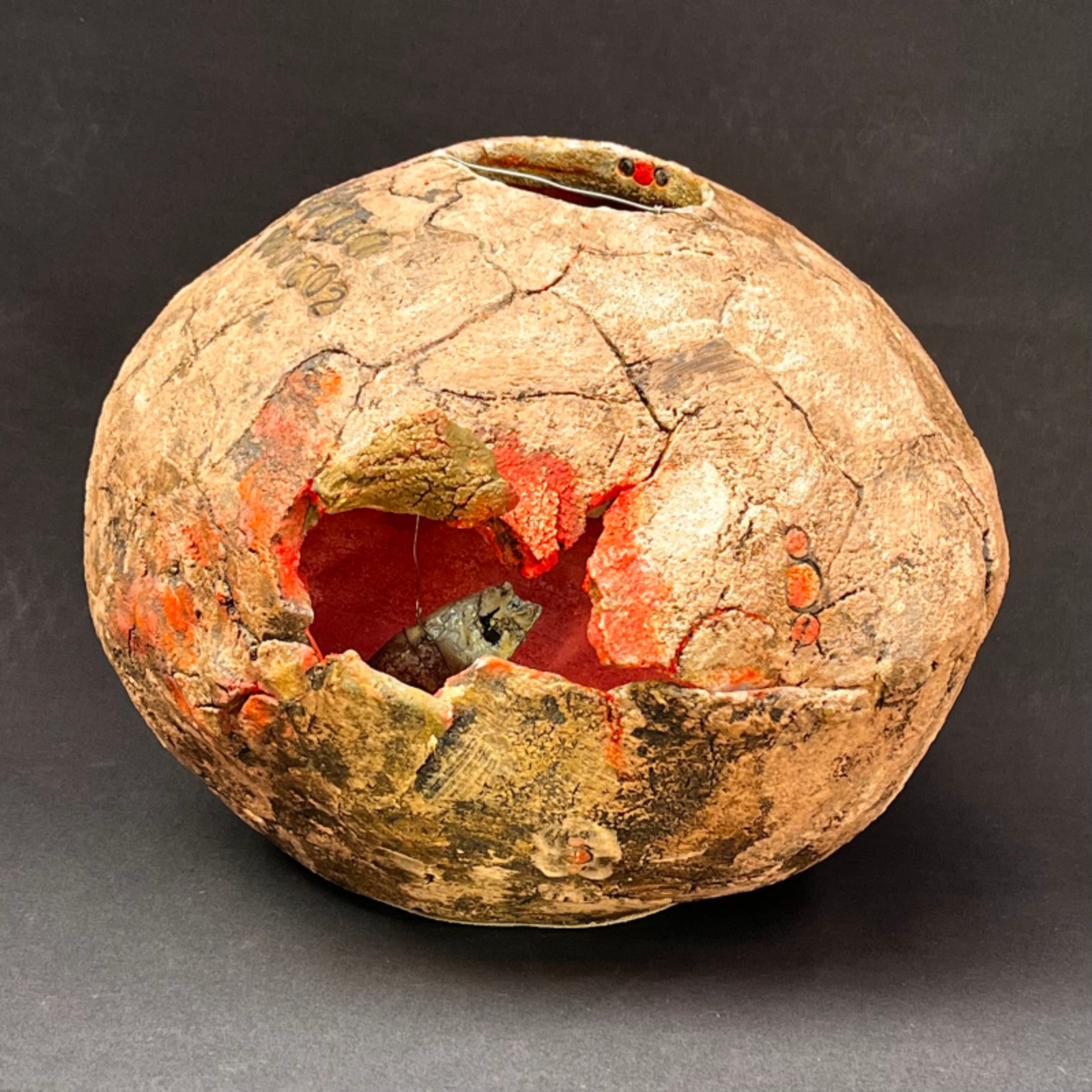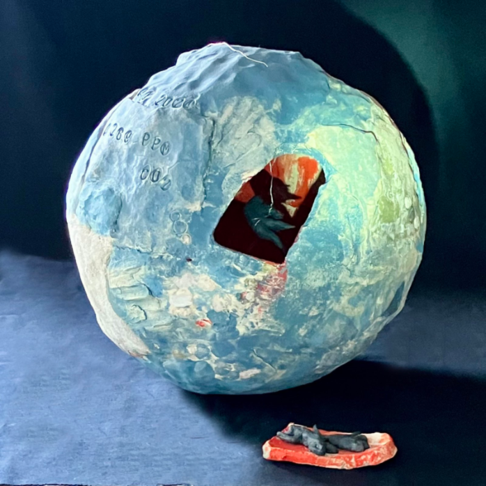 420.97 ppm CO2 avg. May 2022. 2022. Sculpture clay, wire. 10" high x 11.5" diameter. Says Dodds, “There are ‘dead fish” inside this globe. Climate change warms freshwater habitats, reducing dissolved oxygen. This causes bodies of water to dry out and become unlivable.” | 424.00 ppm CO2 avg. May 2023. 2023. Sculpture clay, red stoneware. 10” high x 12.5" diameter. Says the artist, “Inside this globe is a the cabin of an eremite, or hermit. E.O. Wilson predicted that the Anthropocene will be replaced by what he named the Eremocene (the Age of Loneliness) — an era of extreme biodiversity loss in which humans, having destroyed most species, will be alone on the planet with only the domesticated animals that they eat.” | 426.9 ppm CO2 avg. May 2024 2025. Sculpture clay, wire. 13” high x 15” diameter. Dodds explains the clay monkeys in the work: “In 2024, heat-stricken and dehydrated howler monkeys were dropping from trees in Mexico as temperatures rose to over 113° F.”